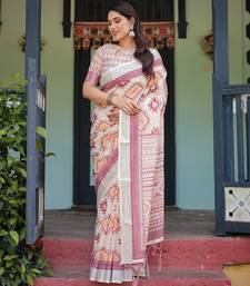 Printed handloom linen saree for women with floral design and tassels