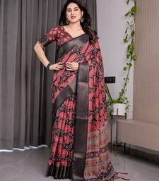 Printed handloom linen weaved with golden zari saree for women with floral design and tassels