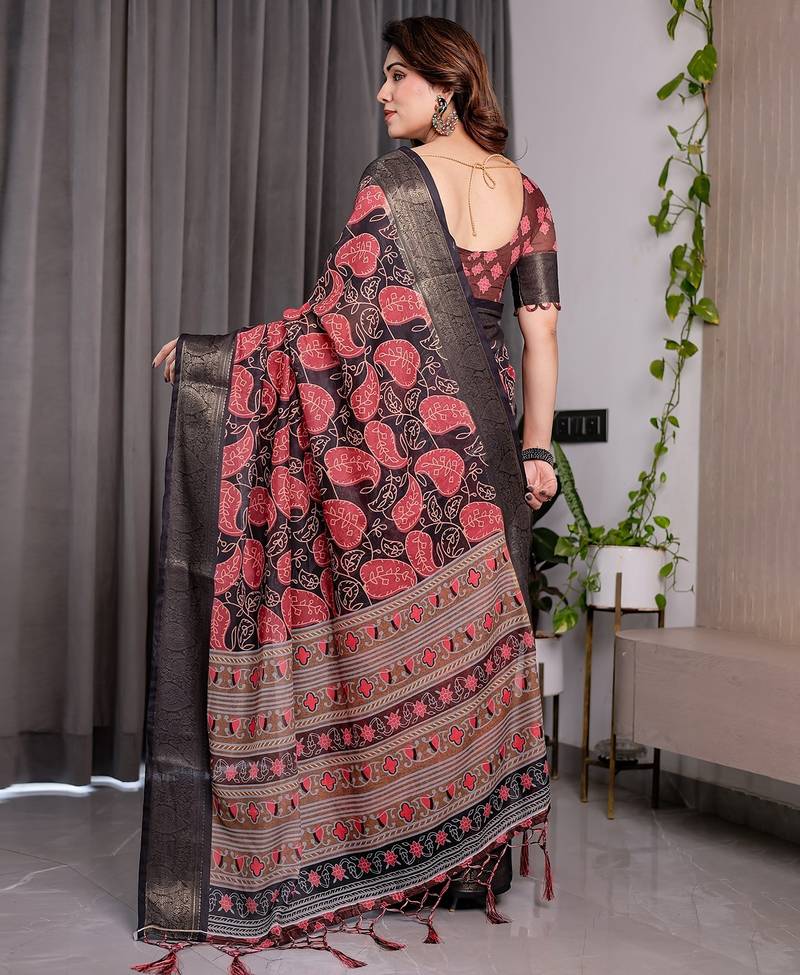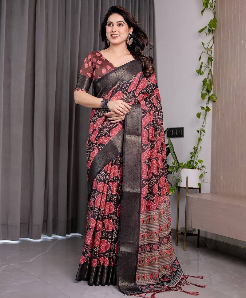 | Product Name | Printed Handloom Linen Weaved With Golden Zari Saree For Women With Floral Design And Tassels | |