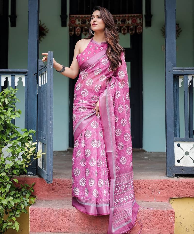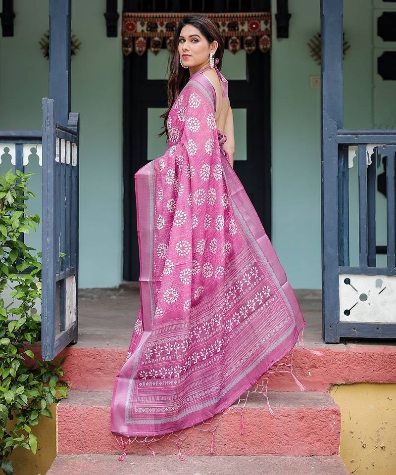 | Product Name | Soft Handloom Linen Saree With Multicolor Floral Print And Tassel Edges | |