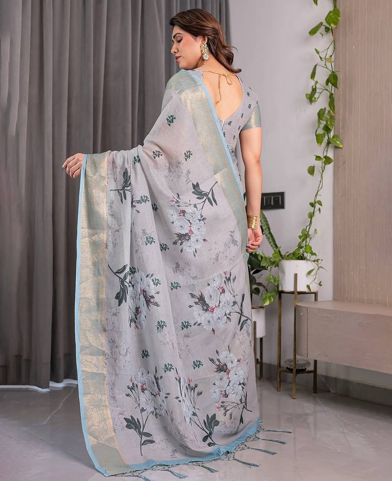 | Product Name | Soft Handloom Linen Weaved With Golden Zari Floral Saree With Tassels Includes 0.8m Blouse | |