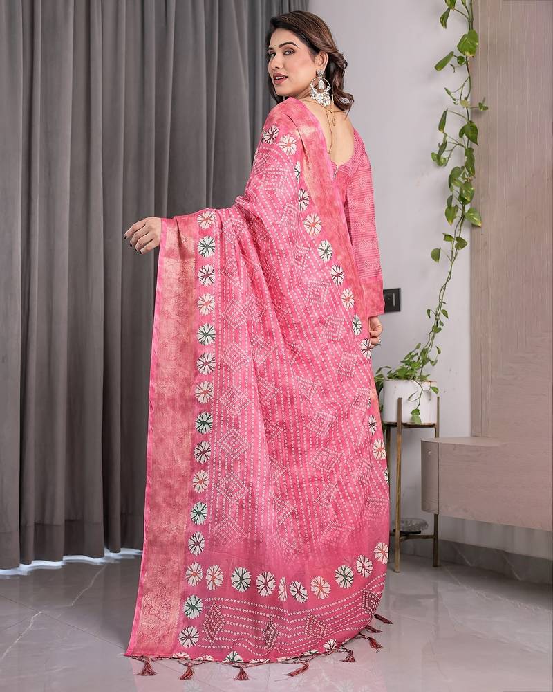 Soft handloom linen weaved with golden zari floral saree with tassels includes 0.8m blouse