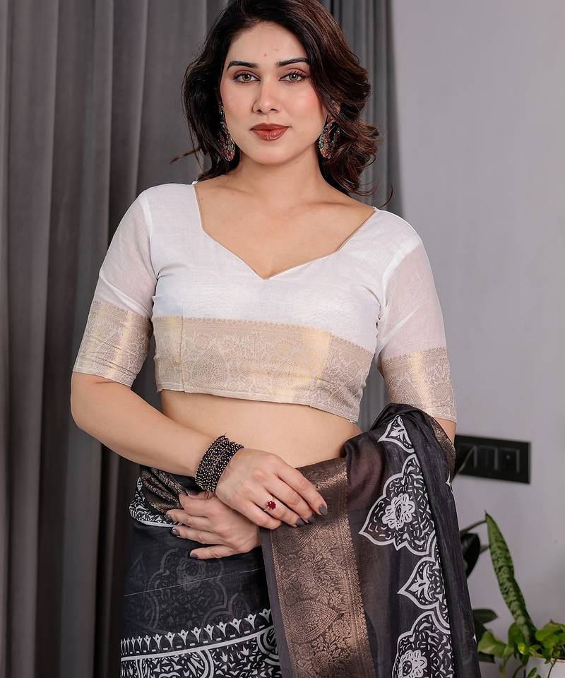 | Product Name | Soft Handloom Linen Weaved With Golden Zari Floral Saree With Tassels Includes 0.8m Blouse | |