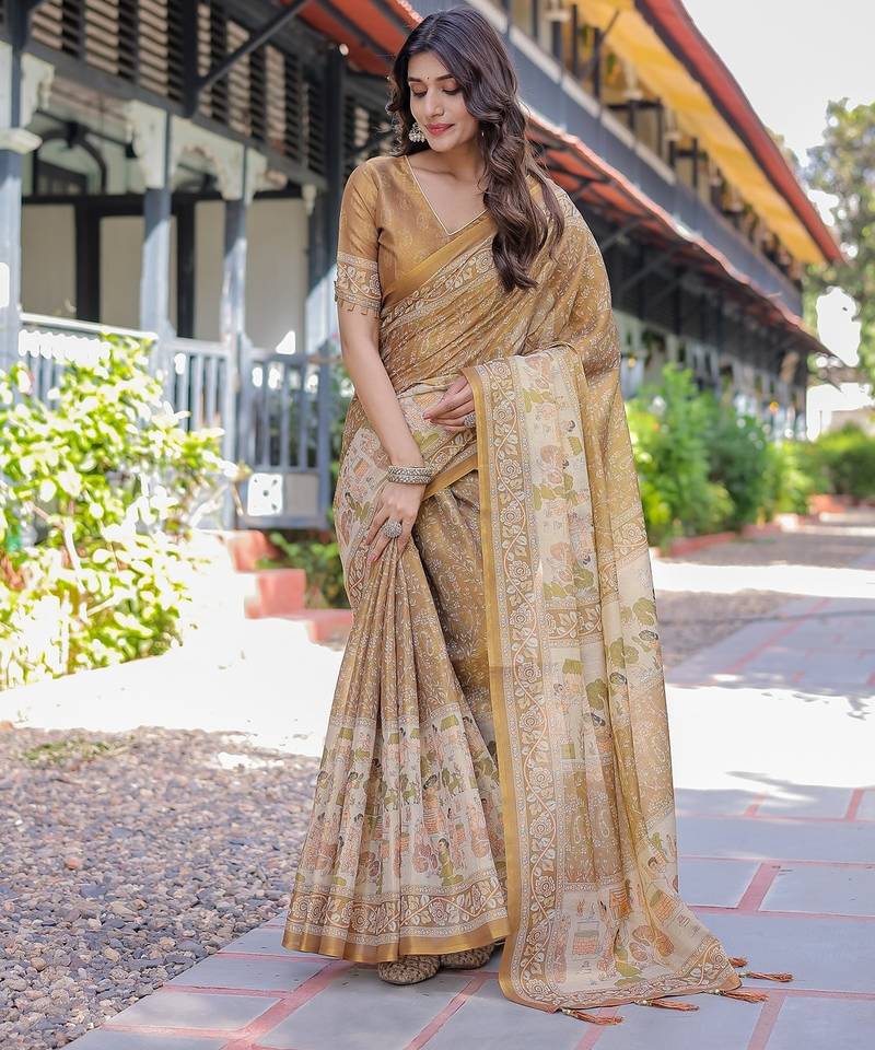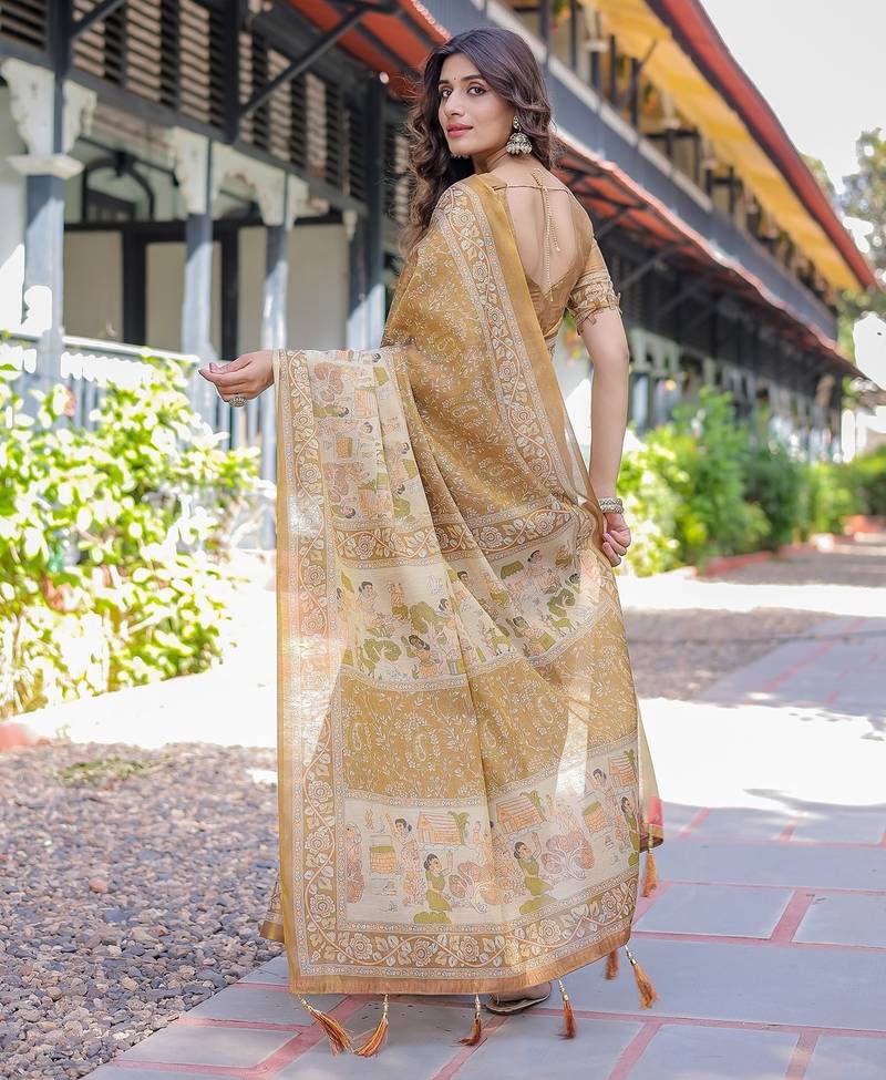 Stylish cotton handloom saree with floral digital print and tassels 5.5m + 0.8m