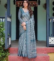 Stylish linen handloom saree with floral digital print and tassels 5.5m + 0.8m