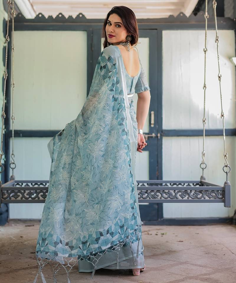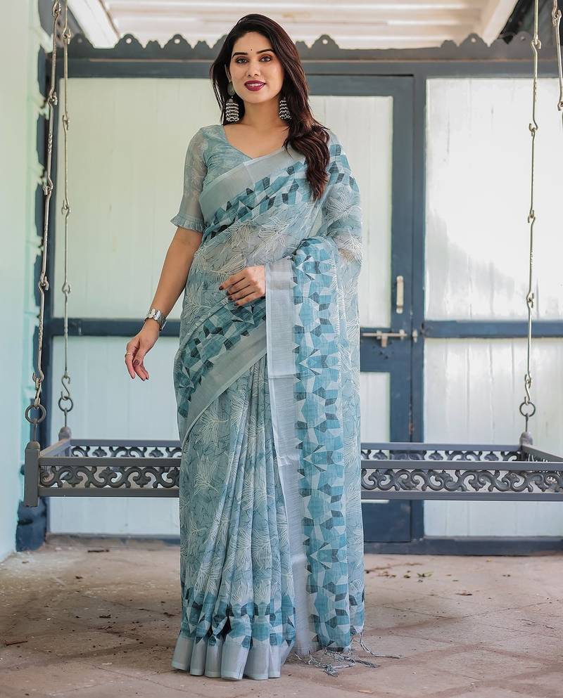 | Product Name | Traditional Handloom Linen Floral Saree With Matching Blouse & Tassel Detailing | |