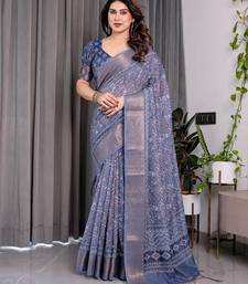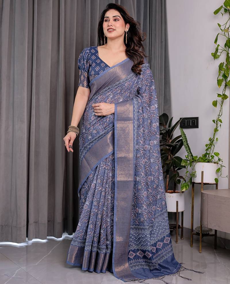 Traditional handloom linen weaved with golden zari floral saree with matching blouse & tassel detailing