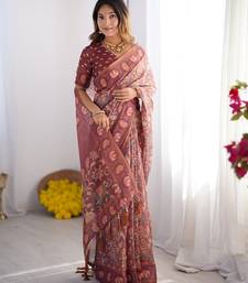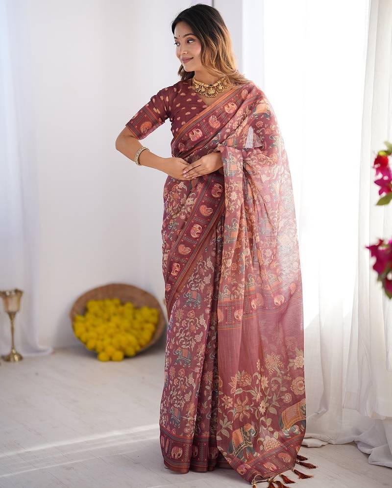 Women s handloom cotton saree floral printed with attached blouse & tassels