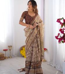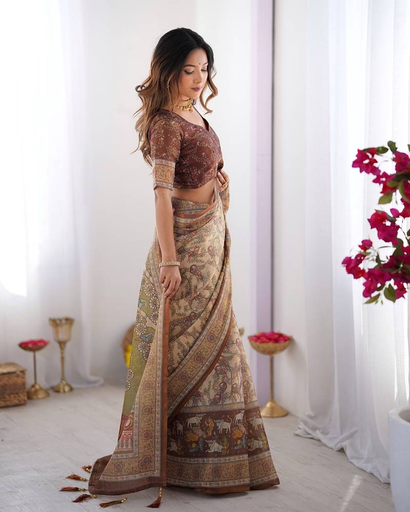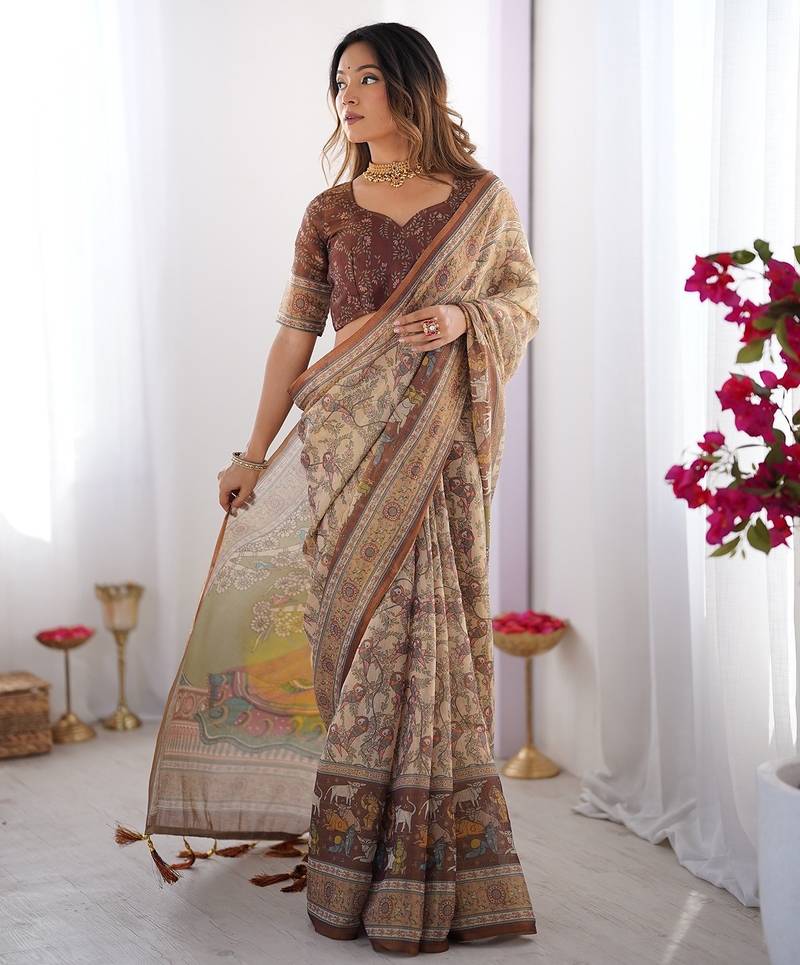 Women s handloom cotton saree floral printed with attached blouse & tassels