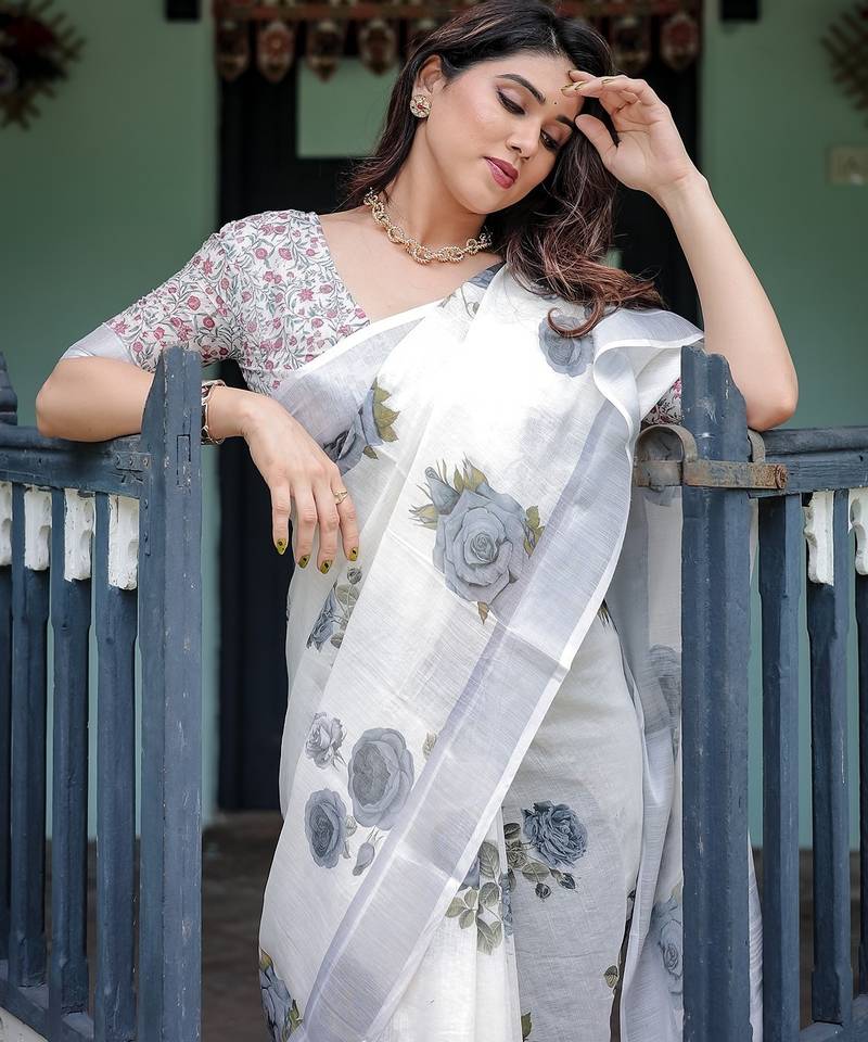 | Product Name | Women S Handloom Linen Saree Floral Printed With Attached Blouse & Tassels | |