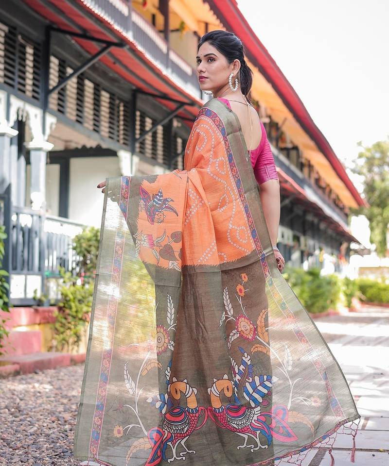 Women s handloom linen saree floral printed with attached blouse & tassels