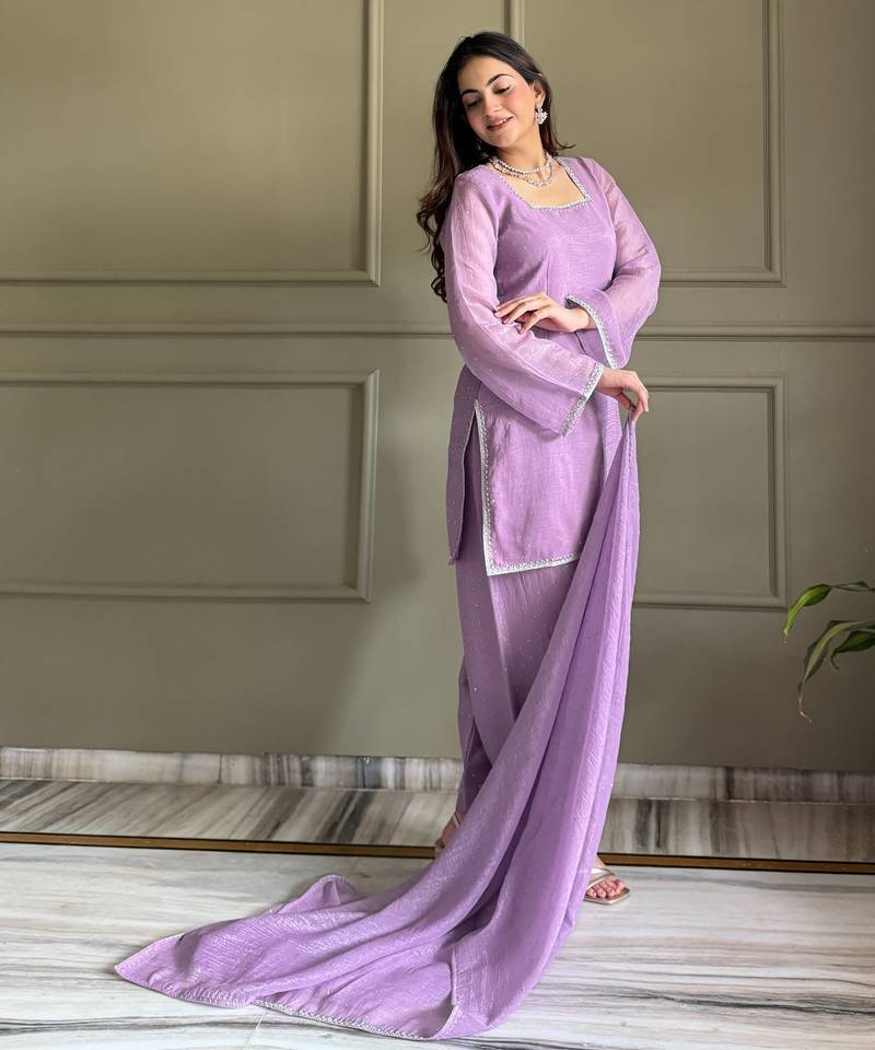 | • | Dupatta | : | Color- Lavender / Fabric- Silk Blend |