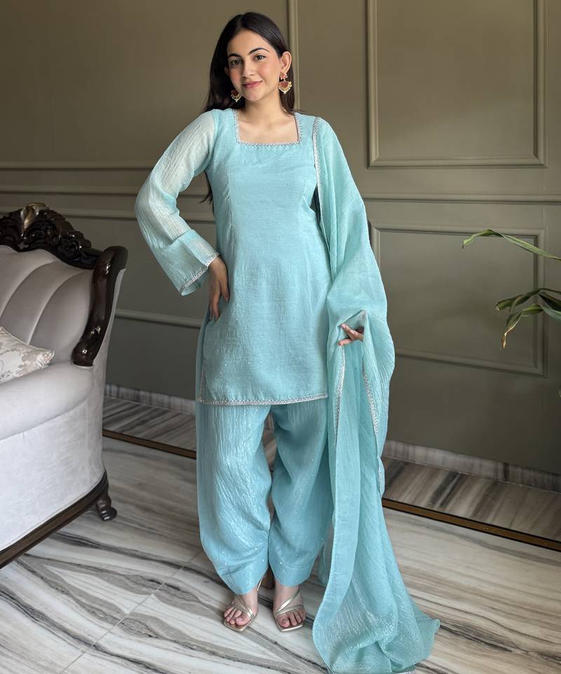 | • | Dupatta | : | Color- Sky Blue / Fabric- Silk Blend |