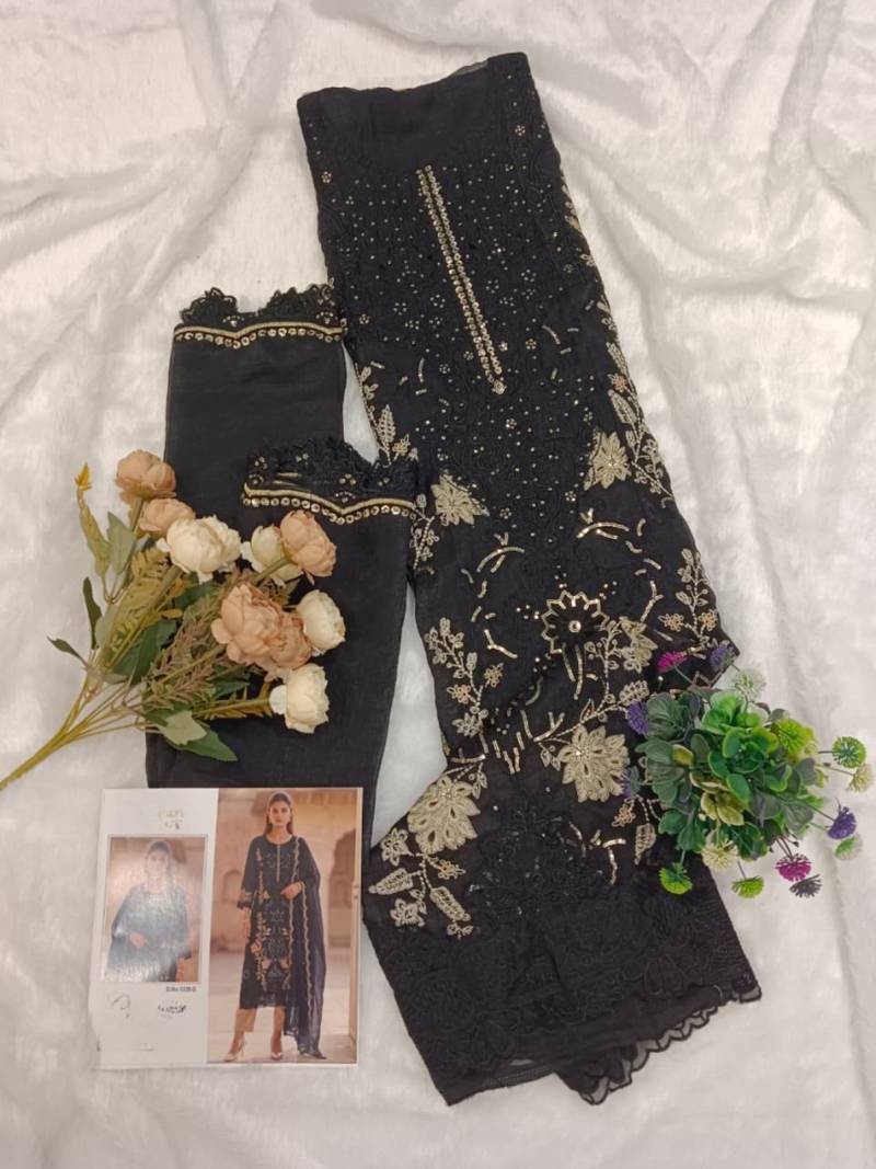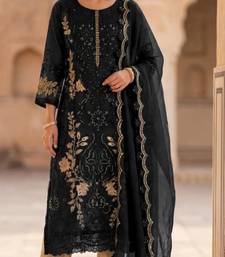Black silk semi stitched suit with embroidery & sequence work