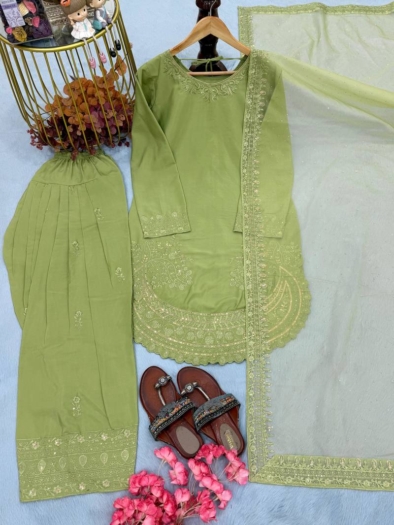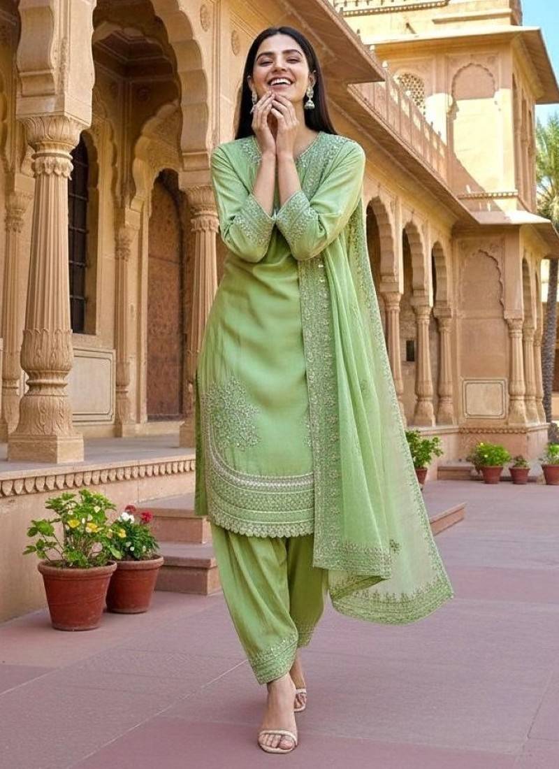 | Product Name | Green Crepe Readymade Suit With Embroidery & Sequence Work | |