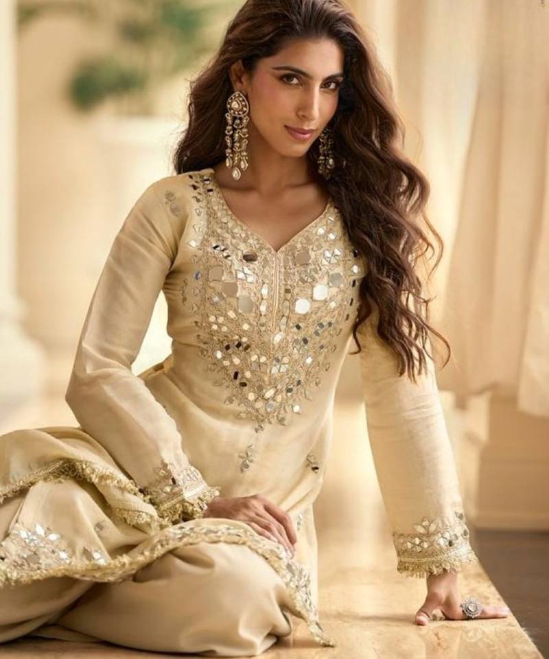 Off white vichitra silk readymade suit with real mirror hand work stitched