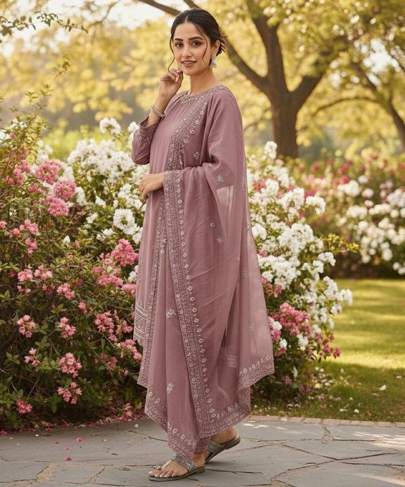 Pink crepe readymade suit with embroidery & sequence work stitched
