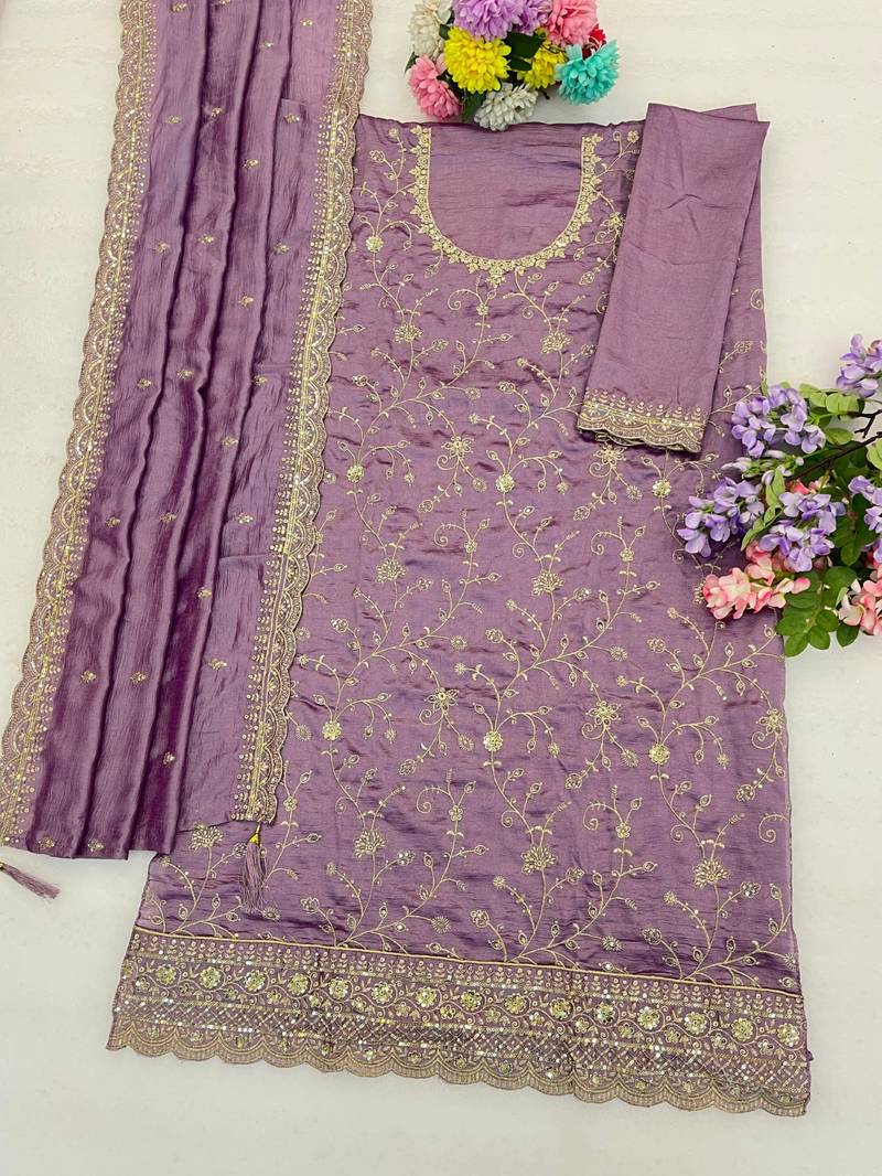 Purple vichitra silk semi stitched suit with embroidery & sequence work