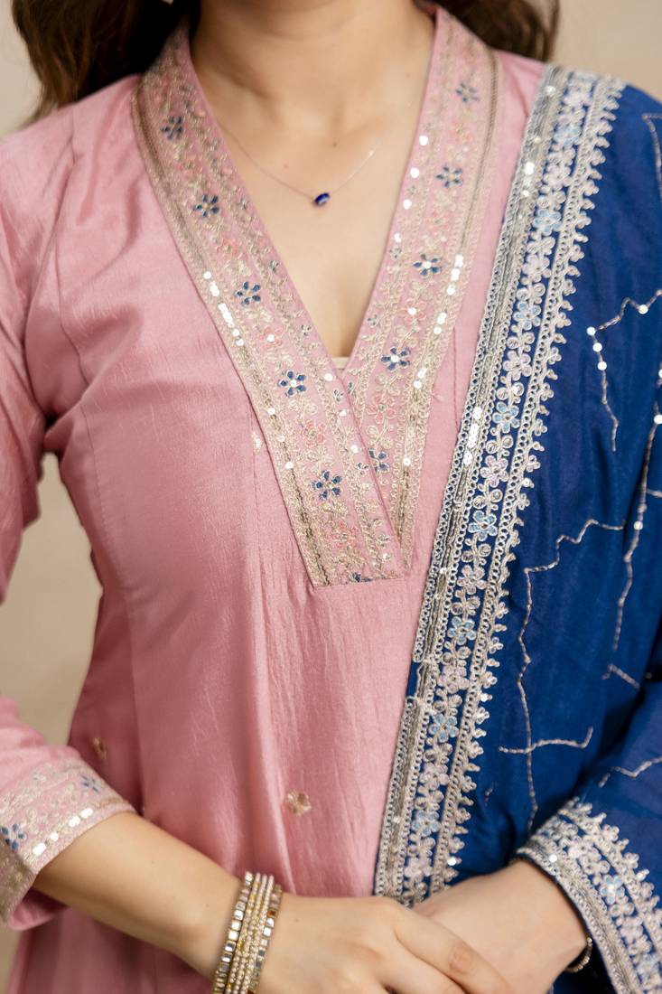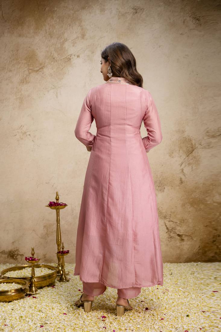 Anarkali kurta set in vichitra silk with embroidery – designer kurti pant dupatta set for women stitched