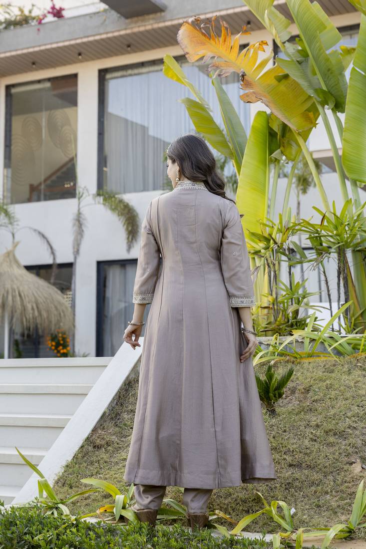 Anarkali kurta set in vichitra silk with embroidery – designer kurti pant dupatta set for women stitched