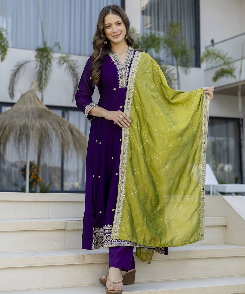 Anarkali kurta set in vichitra silk with embroidery – designer kurti pant dupatta set for women stitched