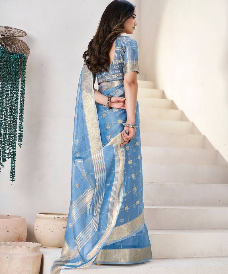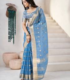 Blue soft linen cotton silk saree with gold zari weaving | elegant party & wedding wear saree
