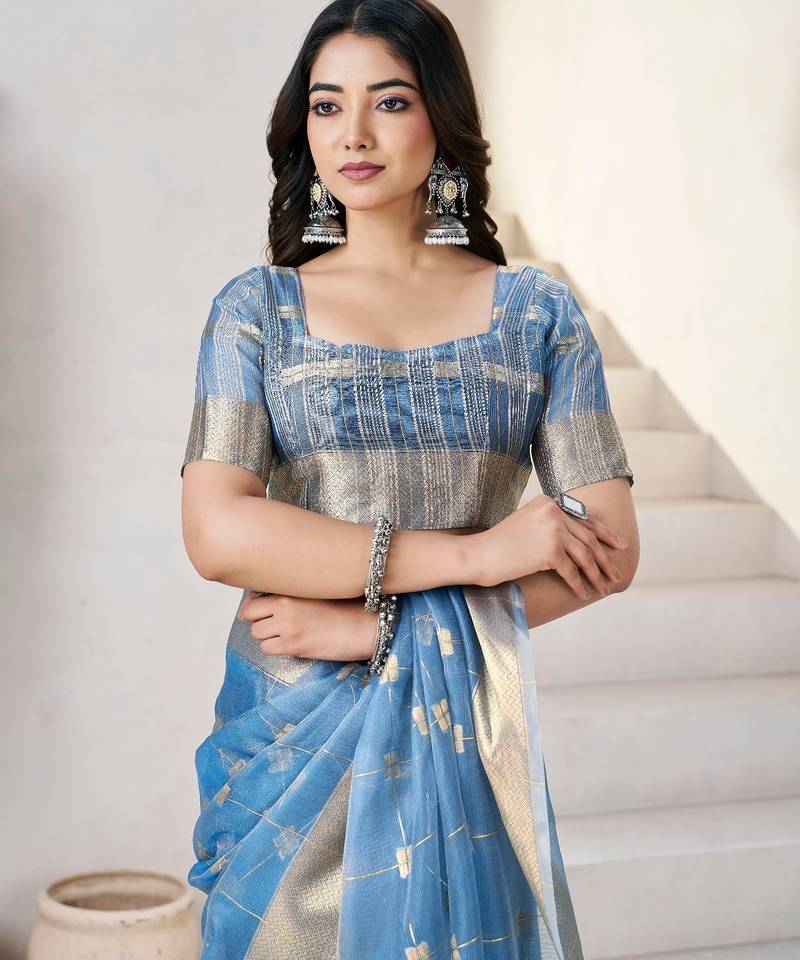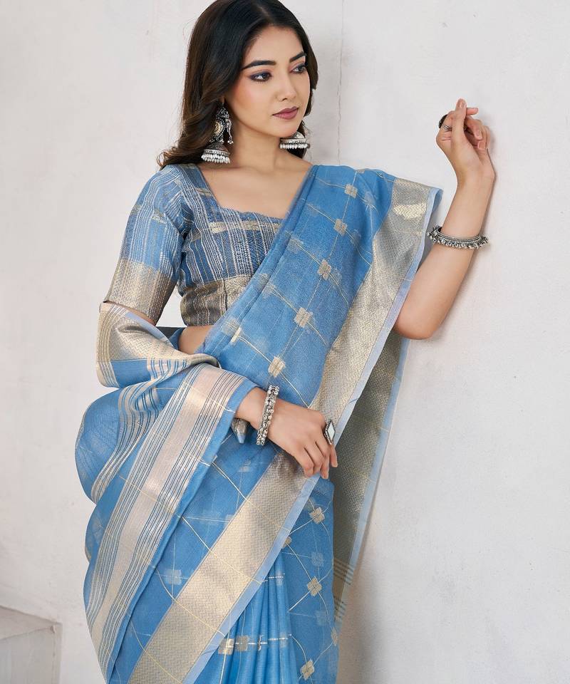 | Product Name | Blue Soft Linen Cotton Silk Saree With Gold Zari Weaving | Elegant Party & Wedding Wear Saree | |