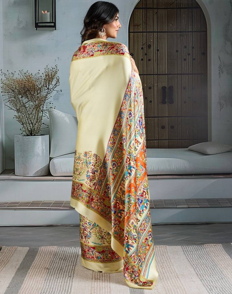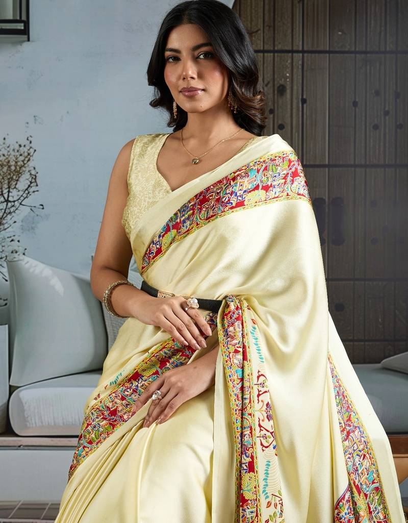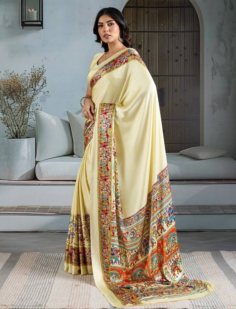 Cream color soft modal satin ajrakh print saree – timeless ethnic collection