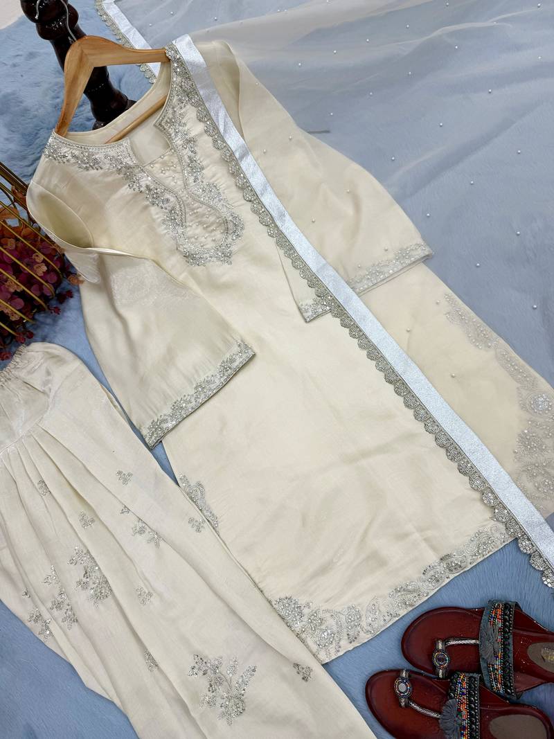 | Product Name | Cream Designer Roman Silk Kurta Farshi Palazzo Set With Embroidered Organza Dupatta | |