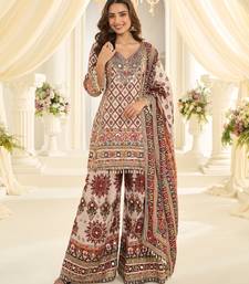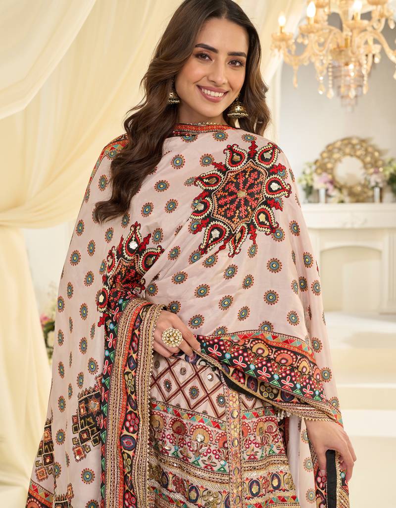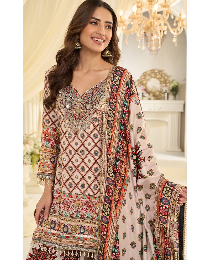 | Product Description | Upgrade Your Ethnic Wardrobe With This Premium Farshi Salwar Kameez Set Crafted From Heavy Natural Crepe Silk. Featuring Elegant Digital Prints Paired With Intricate Aari Work, This Outfit Is Perfect For Festive And Party Wear. |