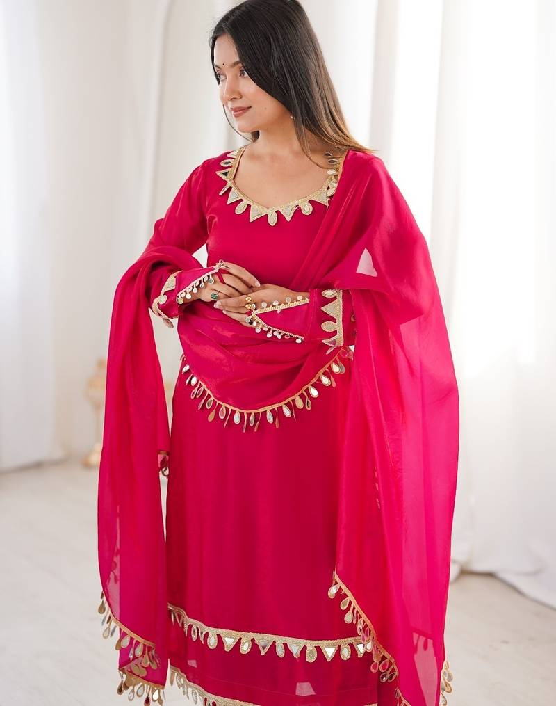 | Product Name | Elegant Fendy Silk Palazzo Suit Set With Real Mirror Lace Work Dupatta – Fully Stitched | |