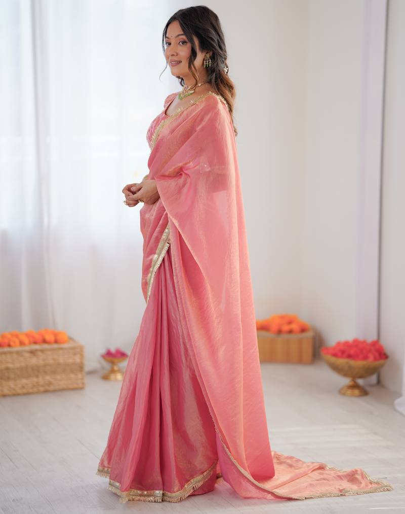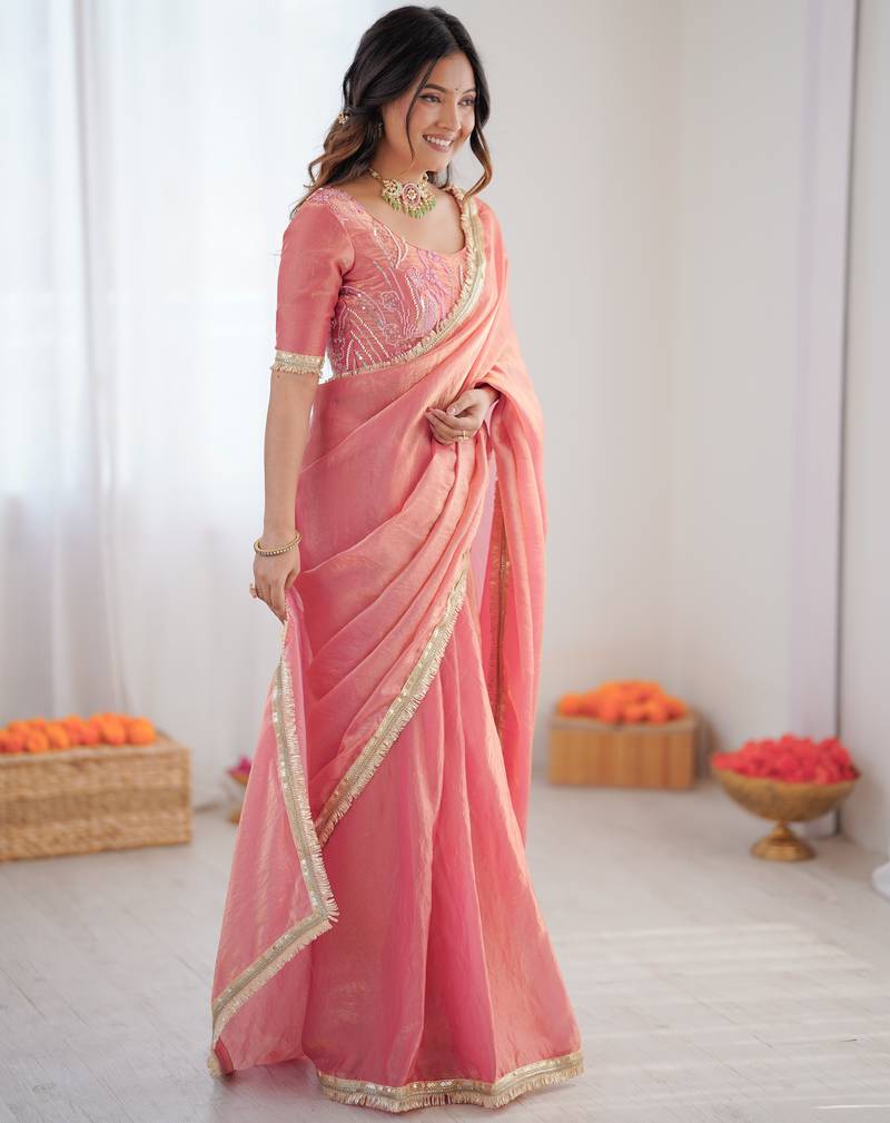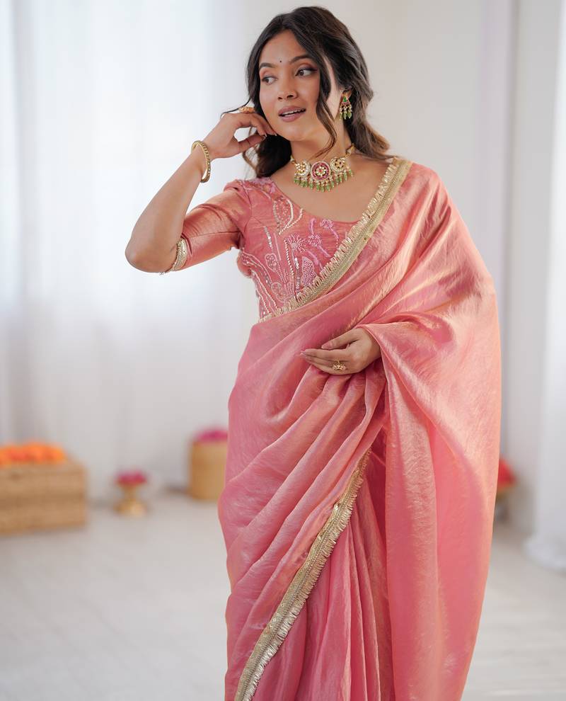 | • | Saree | : | Color- Pink / Fabric- Fancy Fabric |