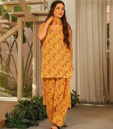 Mustard designer cambric cotton printed kurti set with salwar & dupatta – full stitched daily & office wear