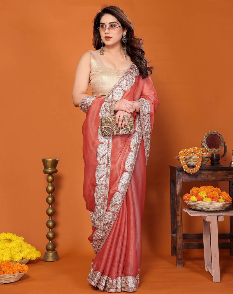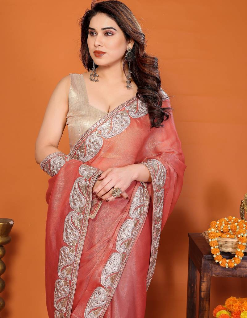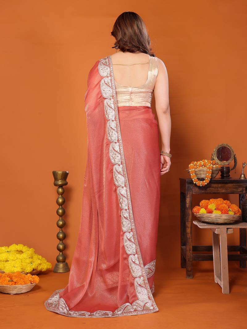 P.c sitara silk embroidery work saree with unstitched gota patti blouse – rich tone designer saree