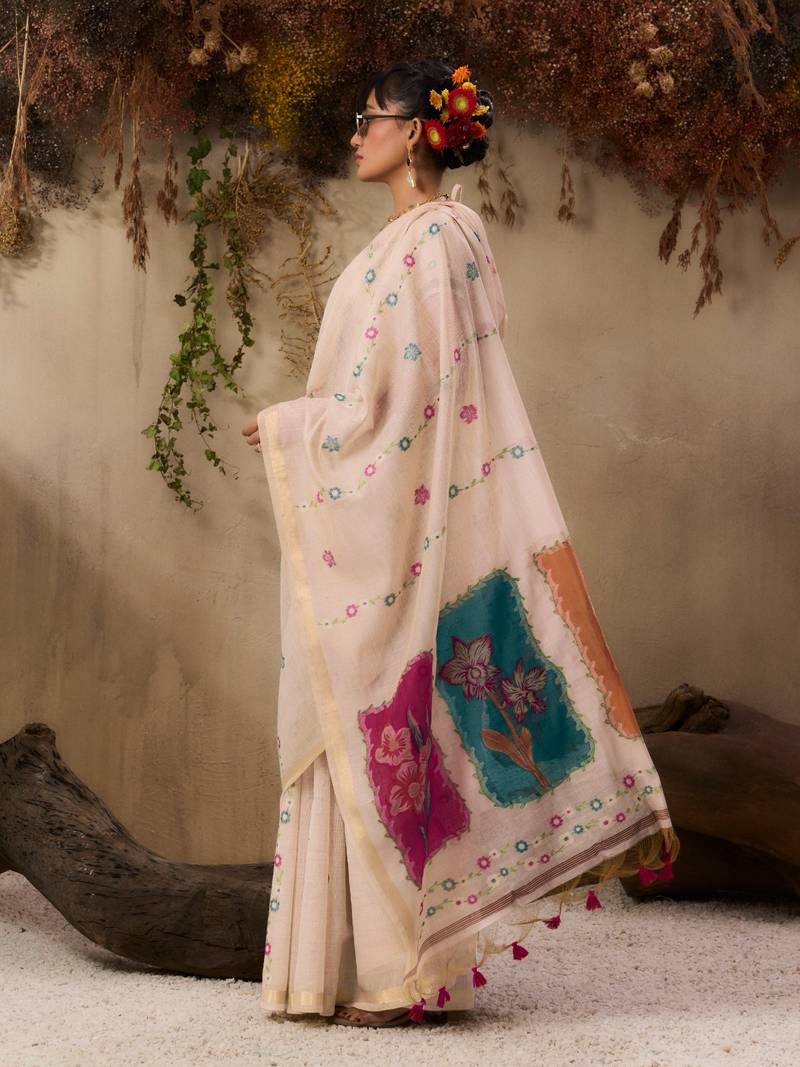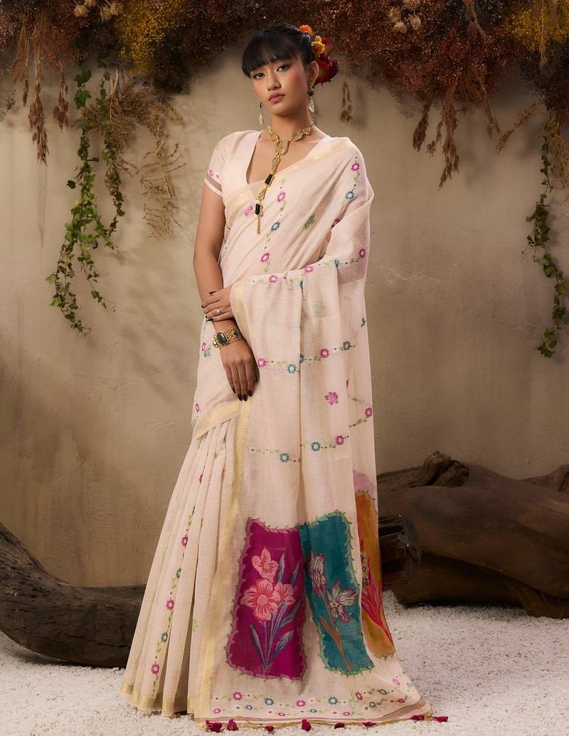 Premium jamdani soft muga cotton saree with resham weaving & zari border | elegant floral pallu saree
