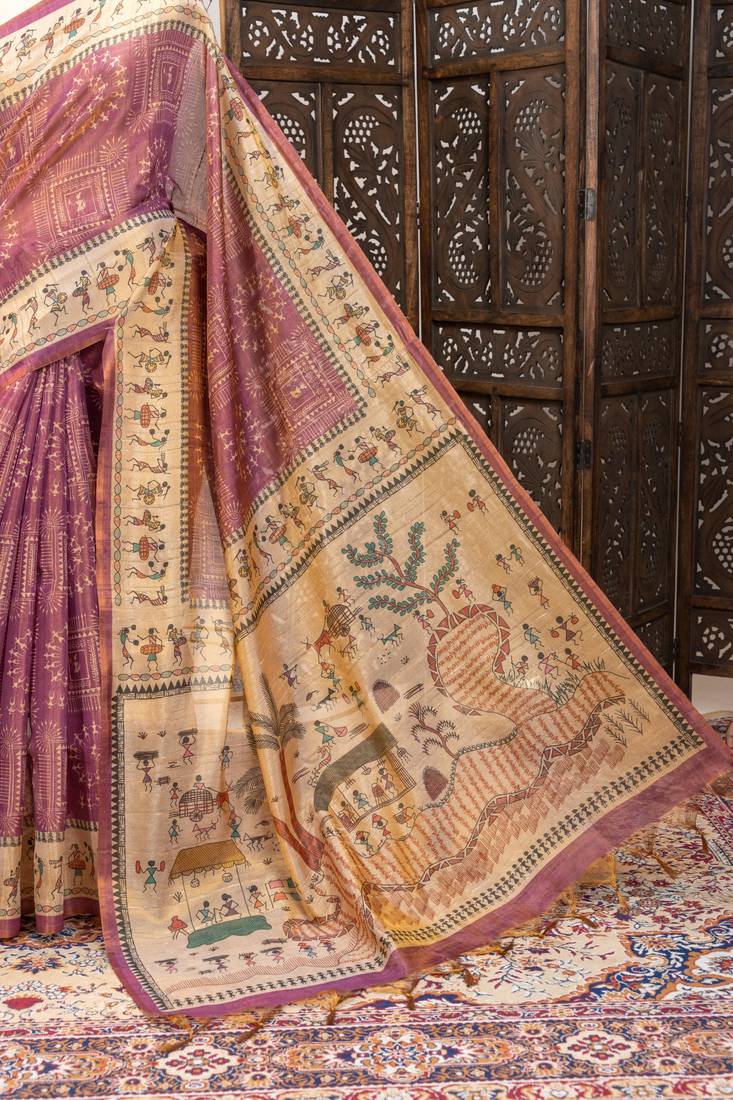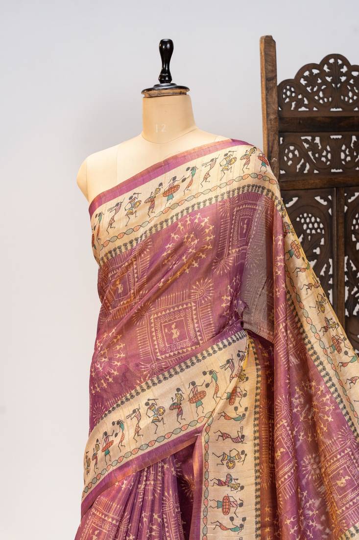 Premium soft pure tissue tussar silk saree with warli printed pallu & contrast border – traditional print