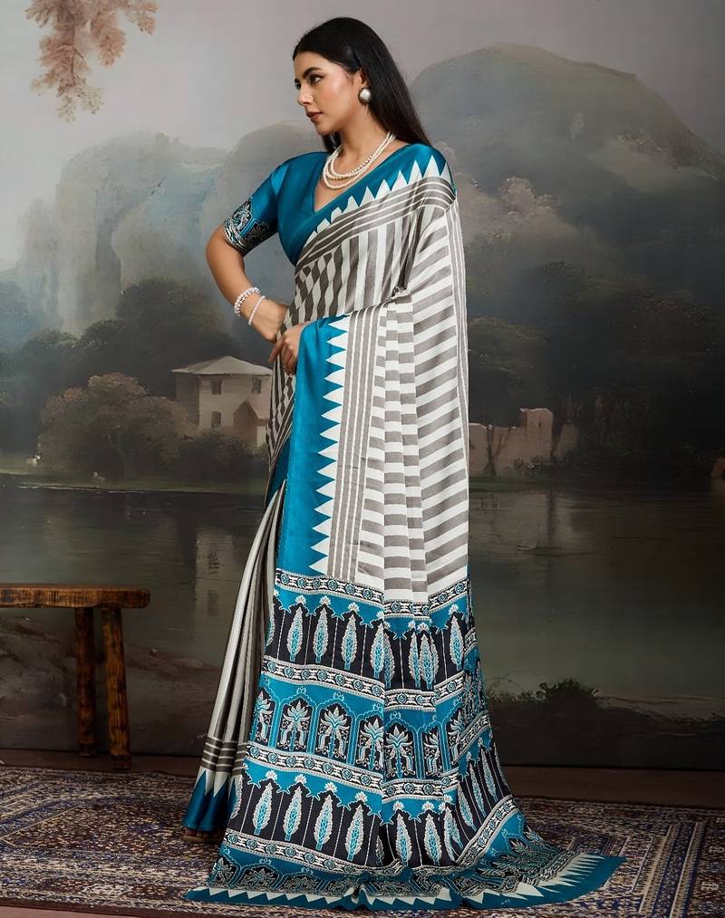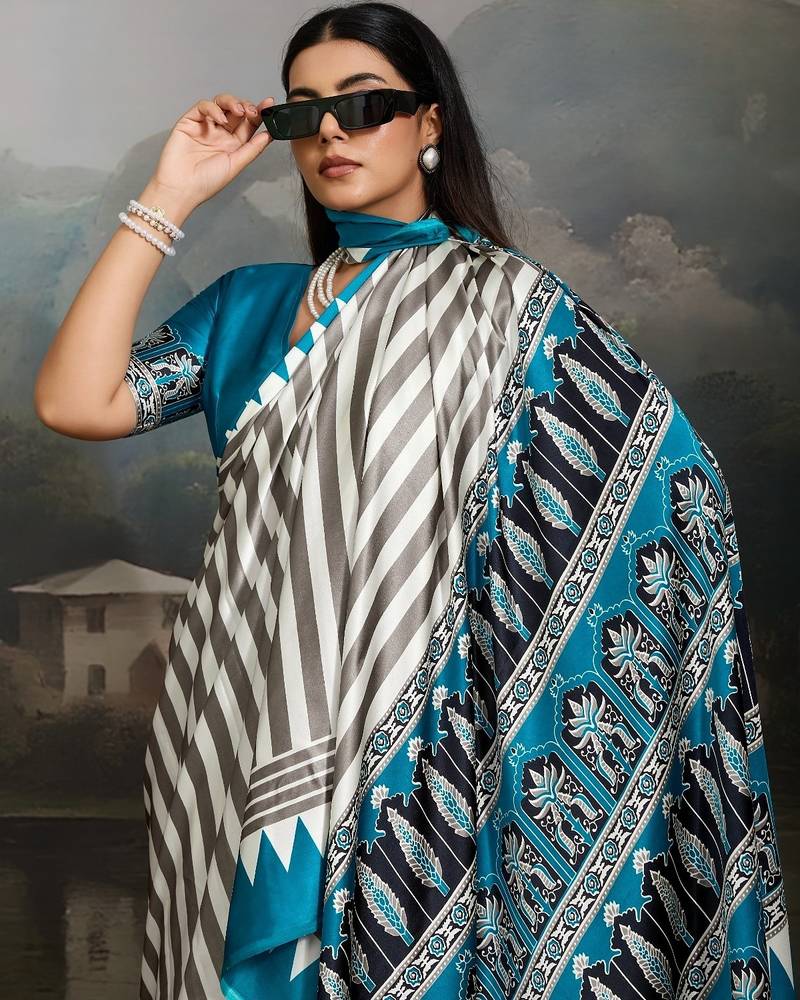 Printed ajrakh satin crepe saree – traditional art with a modern touch