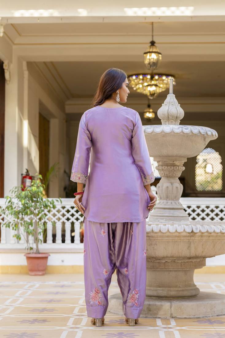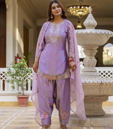 Purple classic traditional patiala suit set in japan satin with rich embroidery & floral motifs for festive stitched