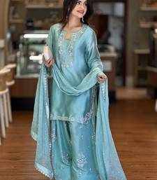 | Product Name | Sky Blue Designer Roman Silk Kurta Farshi Palazzo Set With Embroidered Organza Dupatta | |