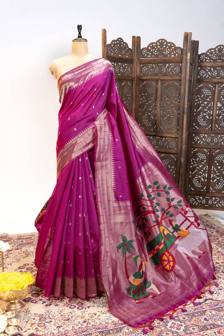 | Product Description | Add Timeless Elegance To Your Ethnic Collection With This Exquisite Soft Khadi Raw Silk Saree. Adorned With Colorful Rich Meena Weaving, The Saree Features A Beautifully Crafted Paithani Pallu That Reflects Traditional Artistry. The Highlight Is Its Classic Triple Muniya Temple Border, Enhancing Its Regal Appeal. The Saree Is Further Decorated With Delicate All Over Small Butties, Adding Subtle Charm And Sophistication. |