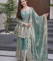 Women’s sky blue embroidered fandy silk kurta sharara set with dupatta – festive & party wear ethnic suit stitched