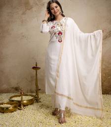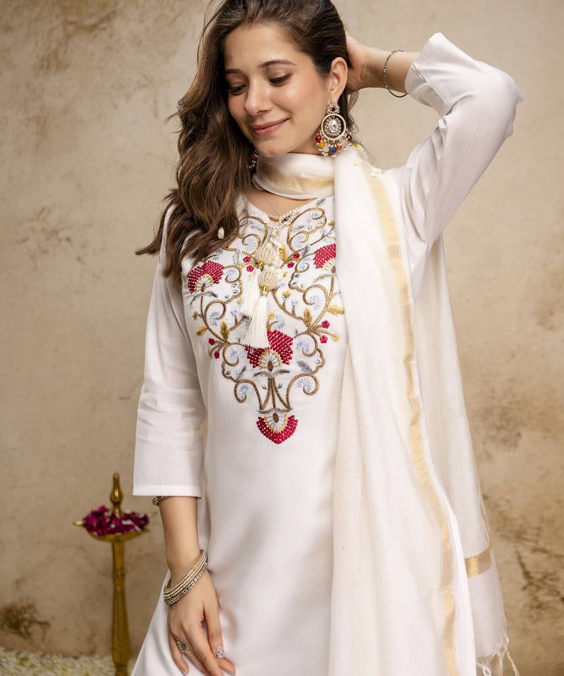 Women’s white roman fabric kurta pant set with embroidered yoke & chanderi bhagalpuri dupatta – straight fit ethnic wear stitched