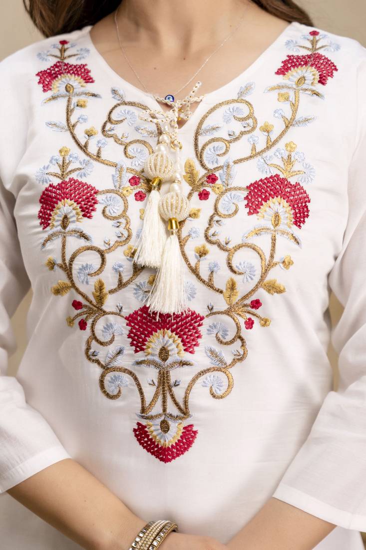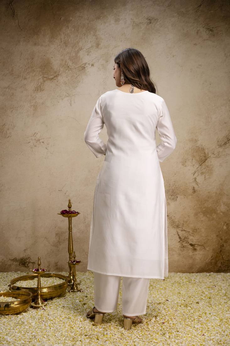 | Product Name | Women’s White Roman Fabric Kurta Pant Set With Embroidered Yoke & Chanderi Bhagalpuri Dupatta – Straight Fit Ethnic Wear | |