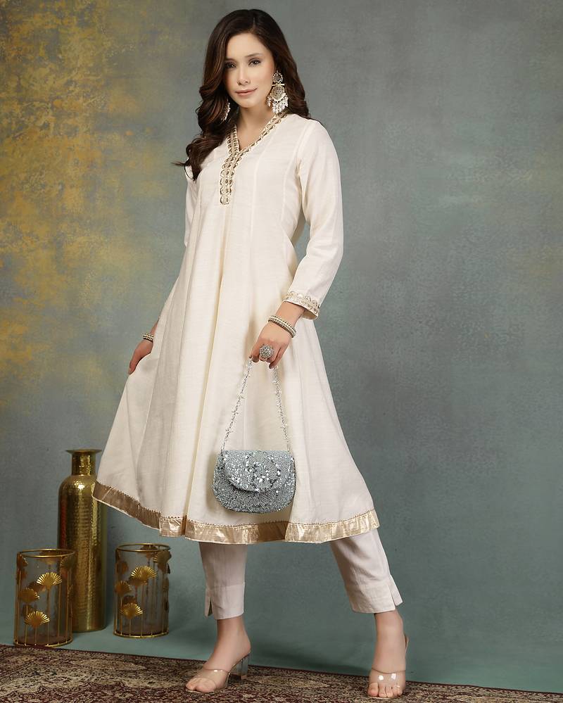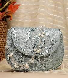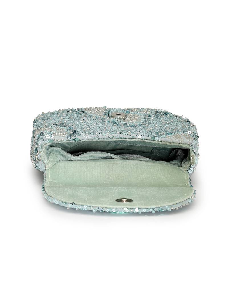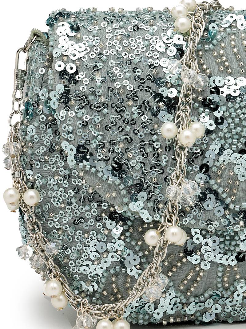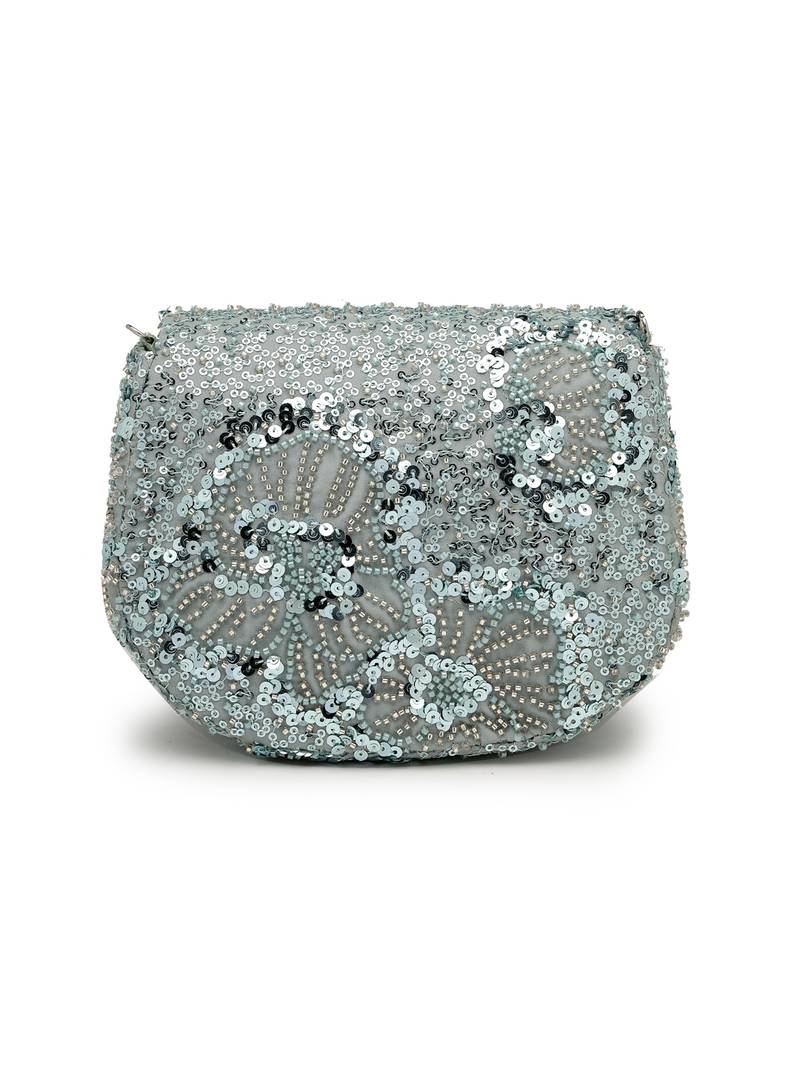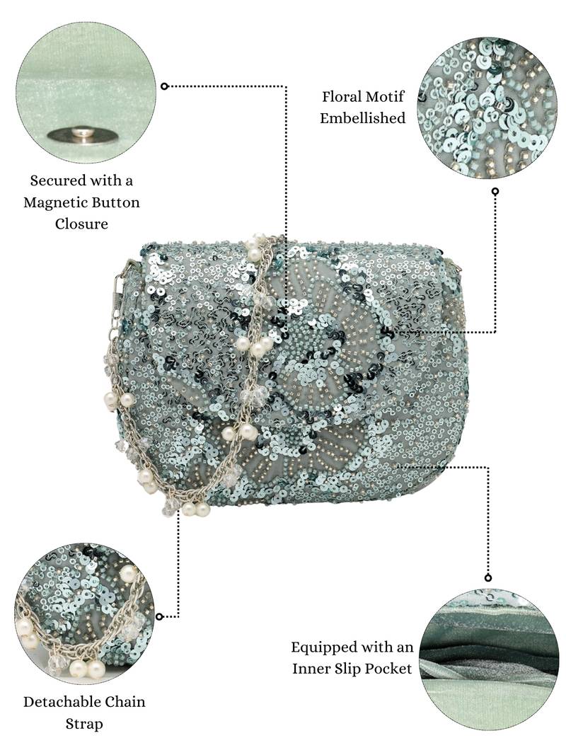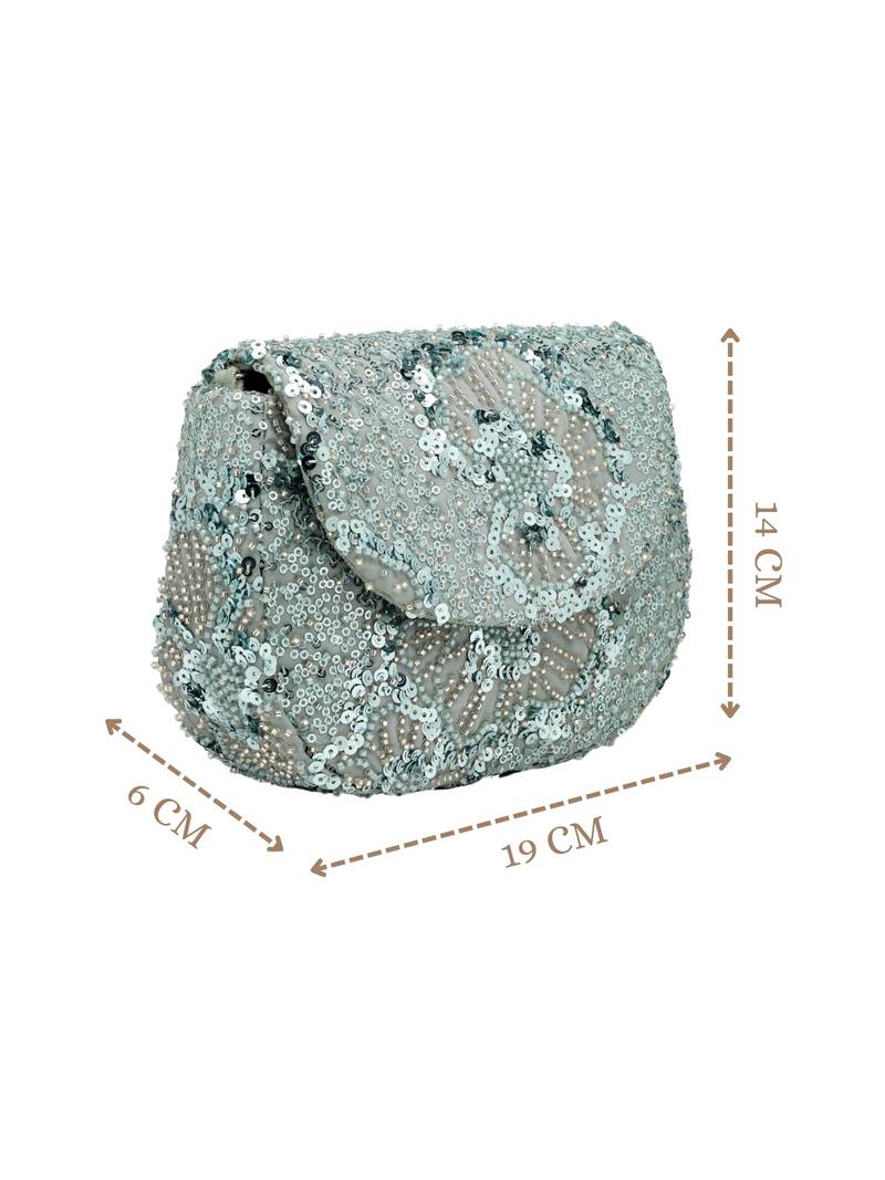 The Anekaant Clutch From The Petal Posh Collection Is Crafted With A Single Spacious Compartment Secured By An Elegant Button Closure, Offering Both Style And Functionality. Finished In A Sophisticated Steel Blue Shade, The Design Is Elevated With Silver Sequin And Bead Detailing For A Refined, Luminous Appeal. Made From Premium Faux Silk And Complemented By A Refined Suede Lining, This Clutch Delivers A Smooth, Luxurious Feel. The Surface Features An Embellished Floral Pattern That Combines Fine Beadwork With Shimmering Sequins, Adding Depth And Elegance To The Overall Design. Designed With An Inner Slip Pocket For Essentials And A Detachable Handle, The Clutch Allows Effortless Styling For Evening Occasions. Dimensions (L × H × W): 19 × 4 × 6 Cm.