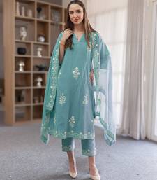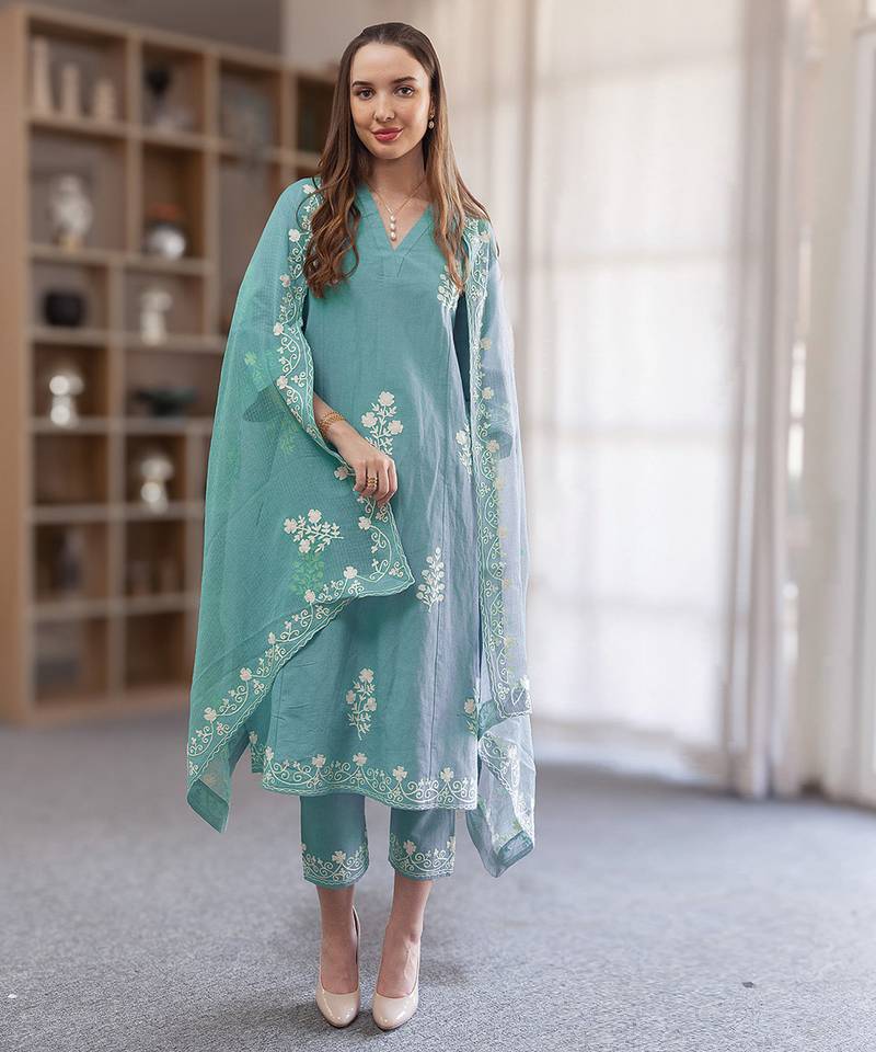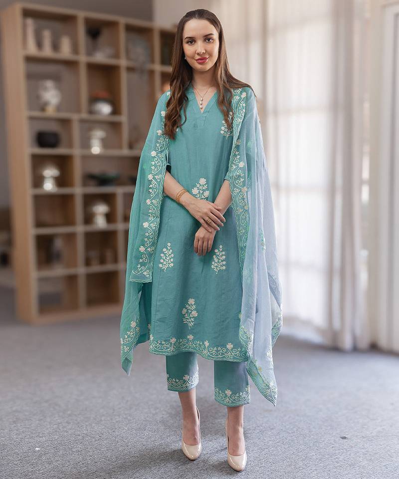 | Product Name | Aqua Blue Embroidered Linen Straight Suit Set | |