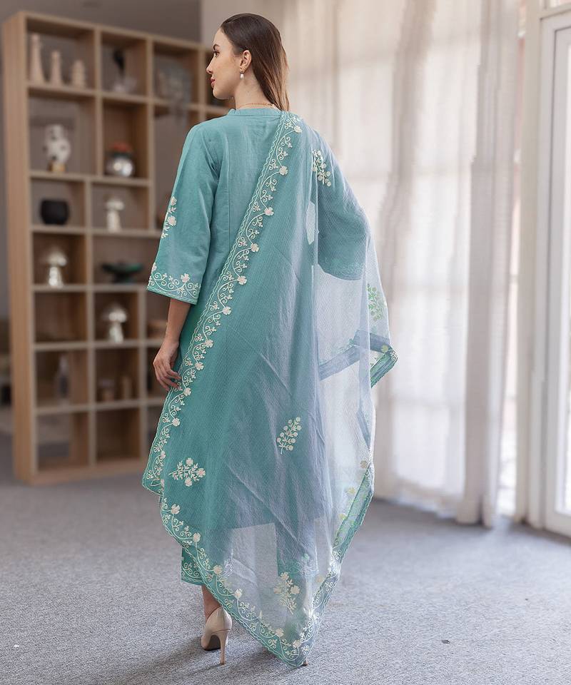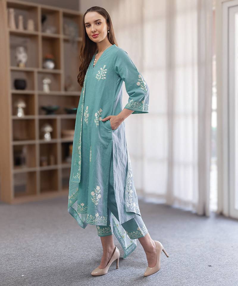 Aqua blue embroidered linen straight suit set