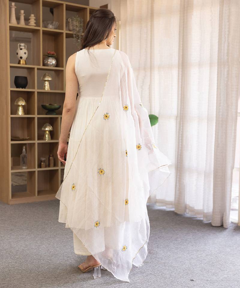 Off white embroidered mulmul anarkali set