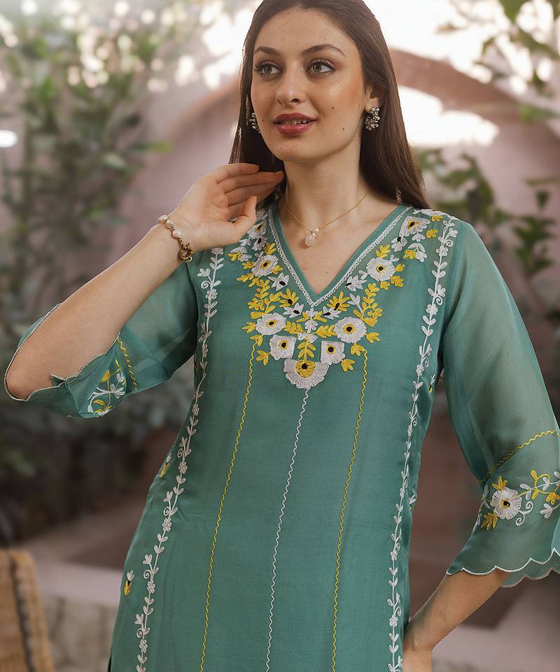 Green embroidered viscose straight suit set
