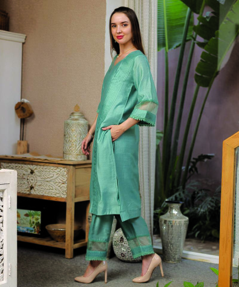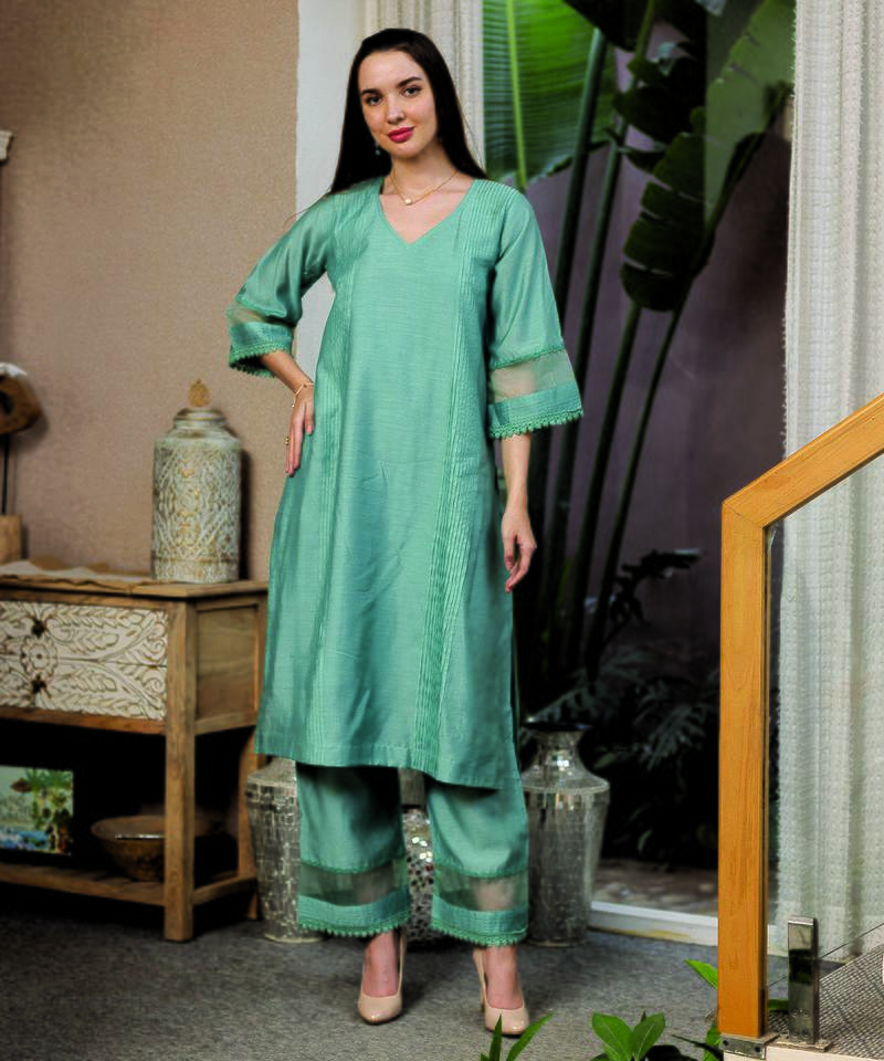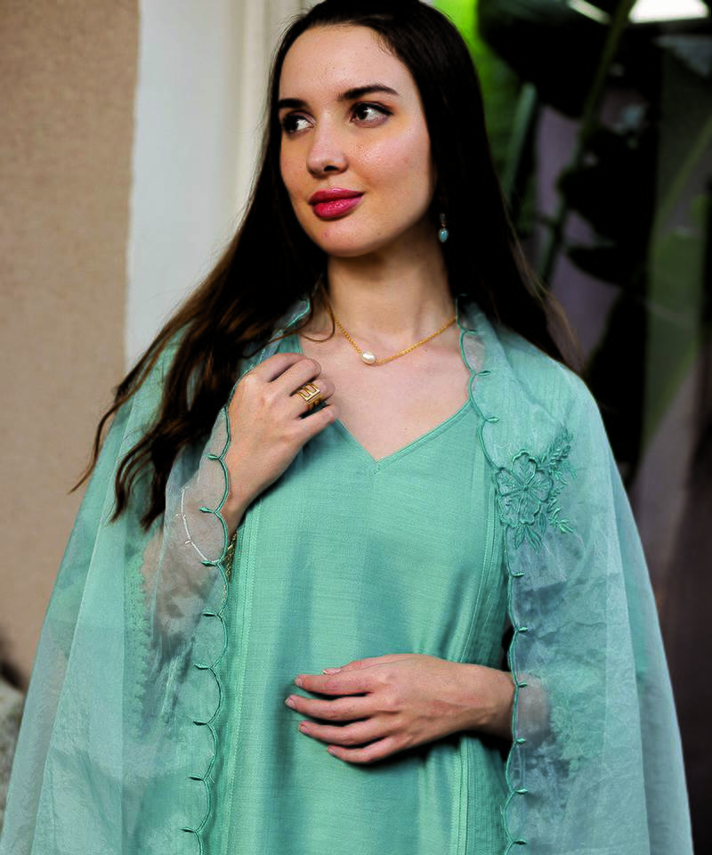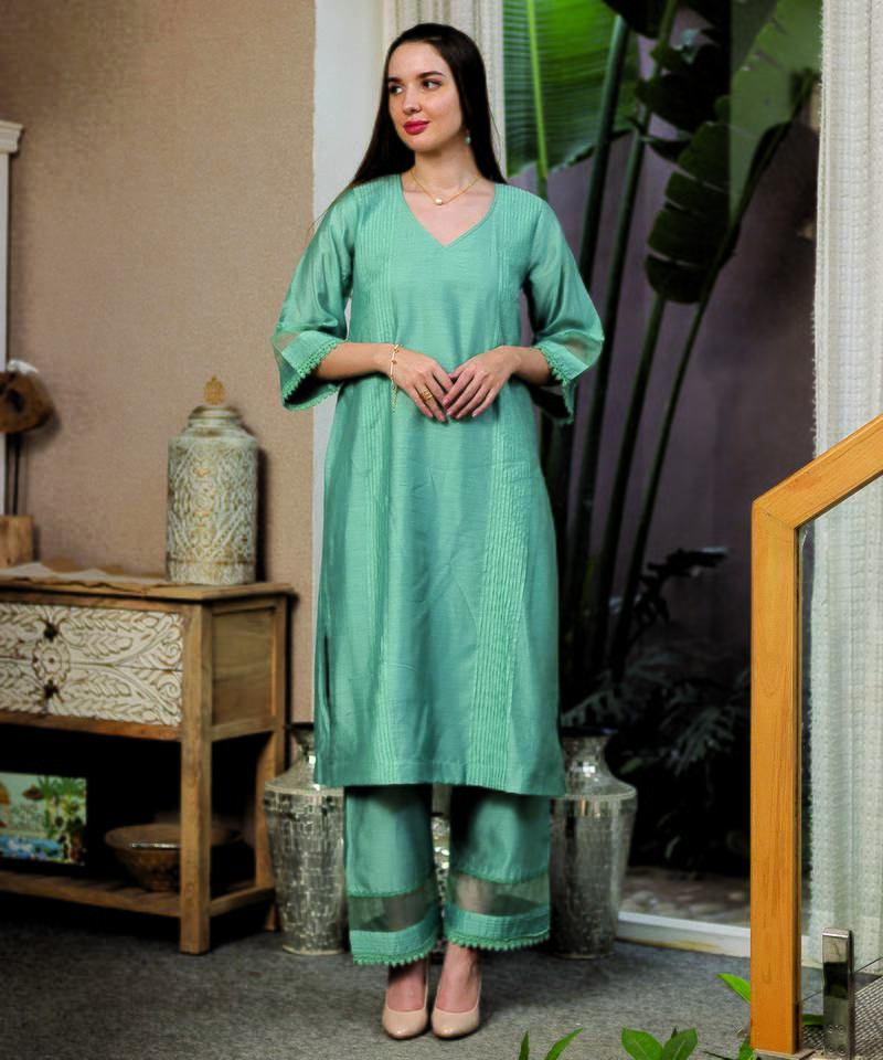| Product Description | Crafted In Elegant Chanderi Fabric, This Mint Green Embroidered Straight Suit Set Features A Rich Tone With Fine Detailing. The Lightweight Texture And Graceful Silhouette Make It Perfect For Festive Occasions, Offering A Stylish And Refined Look With A Hint Of Traditional Charm.