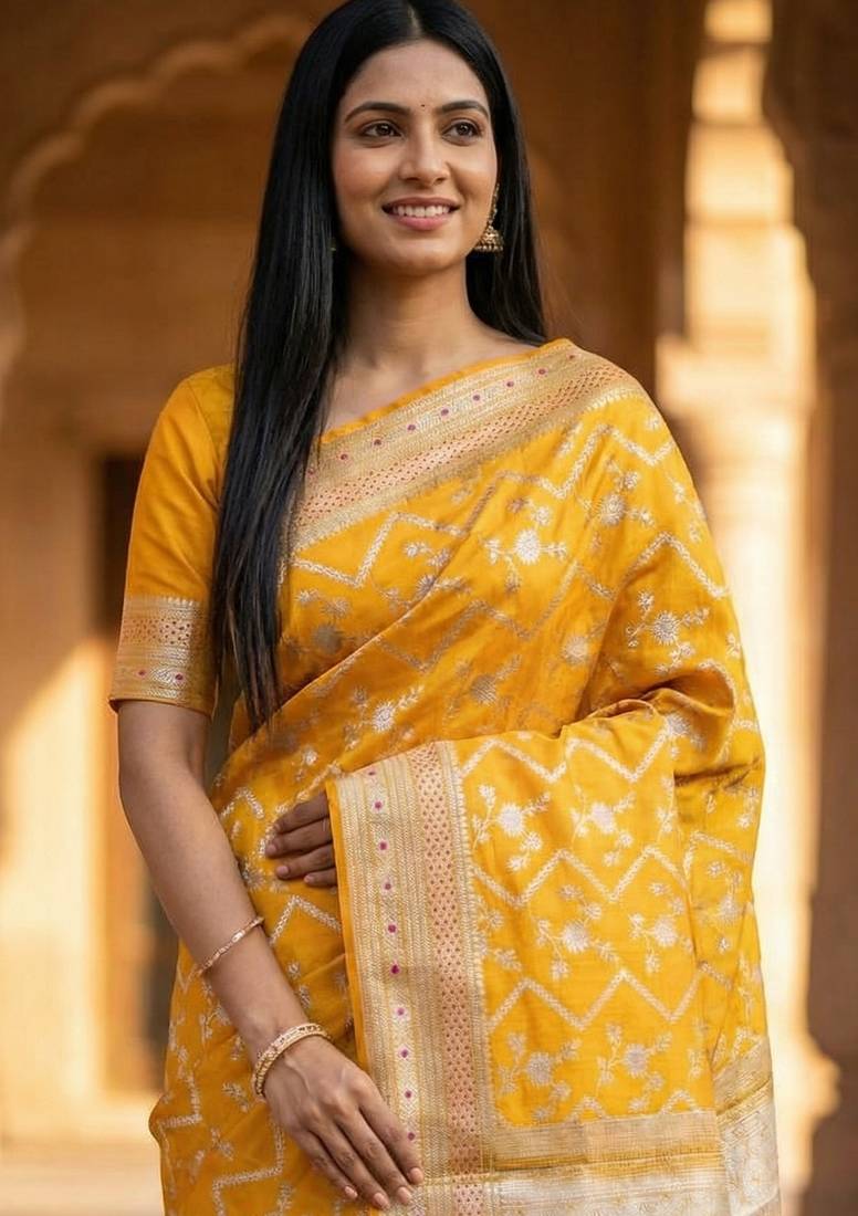 | • | Saree | : | Color- Mustard / Fabric- Pure Banarasi Silk |